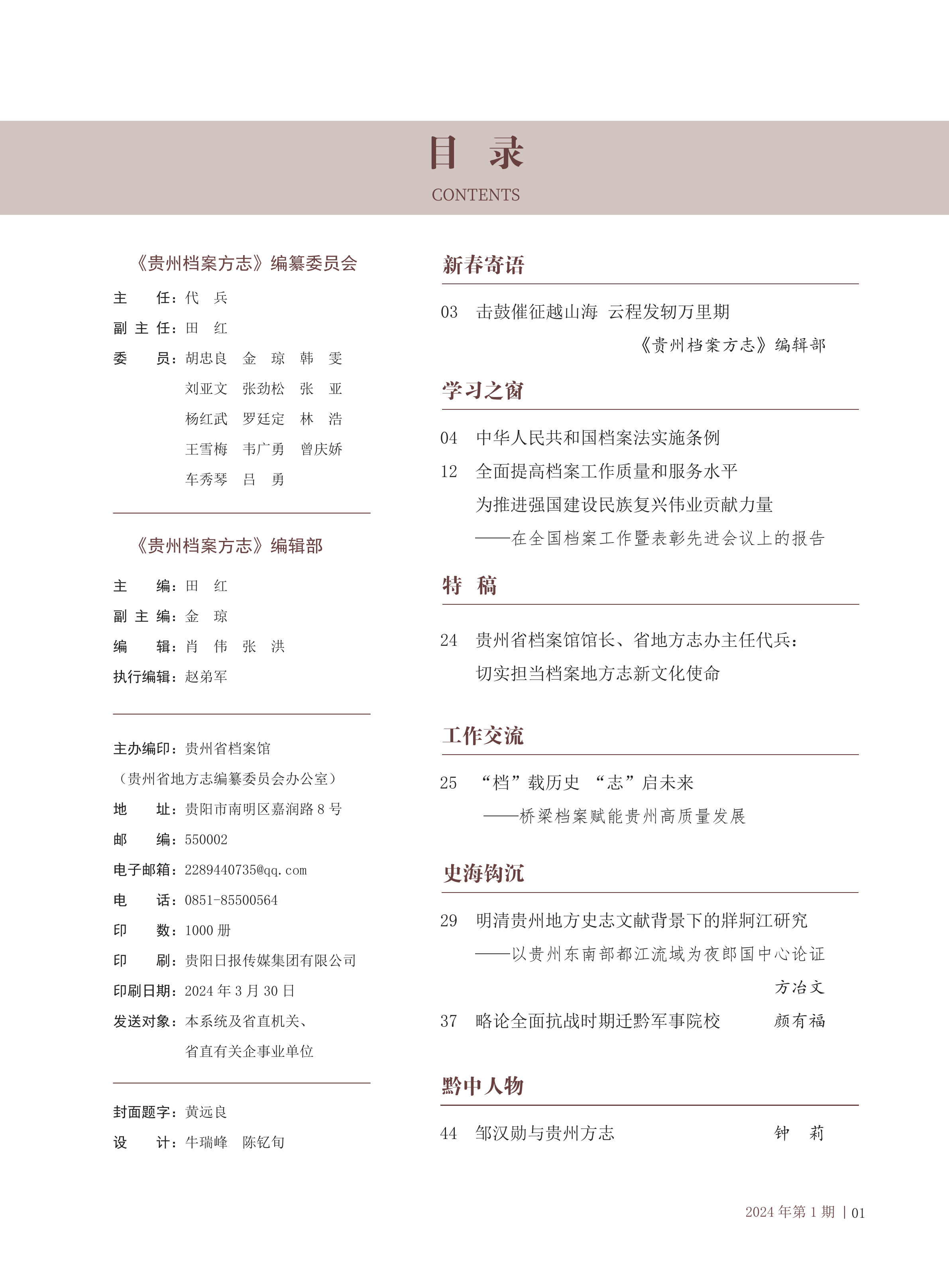 《貴州檔案方志》2024年第1期目錄