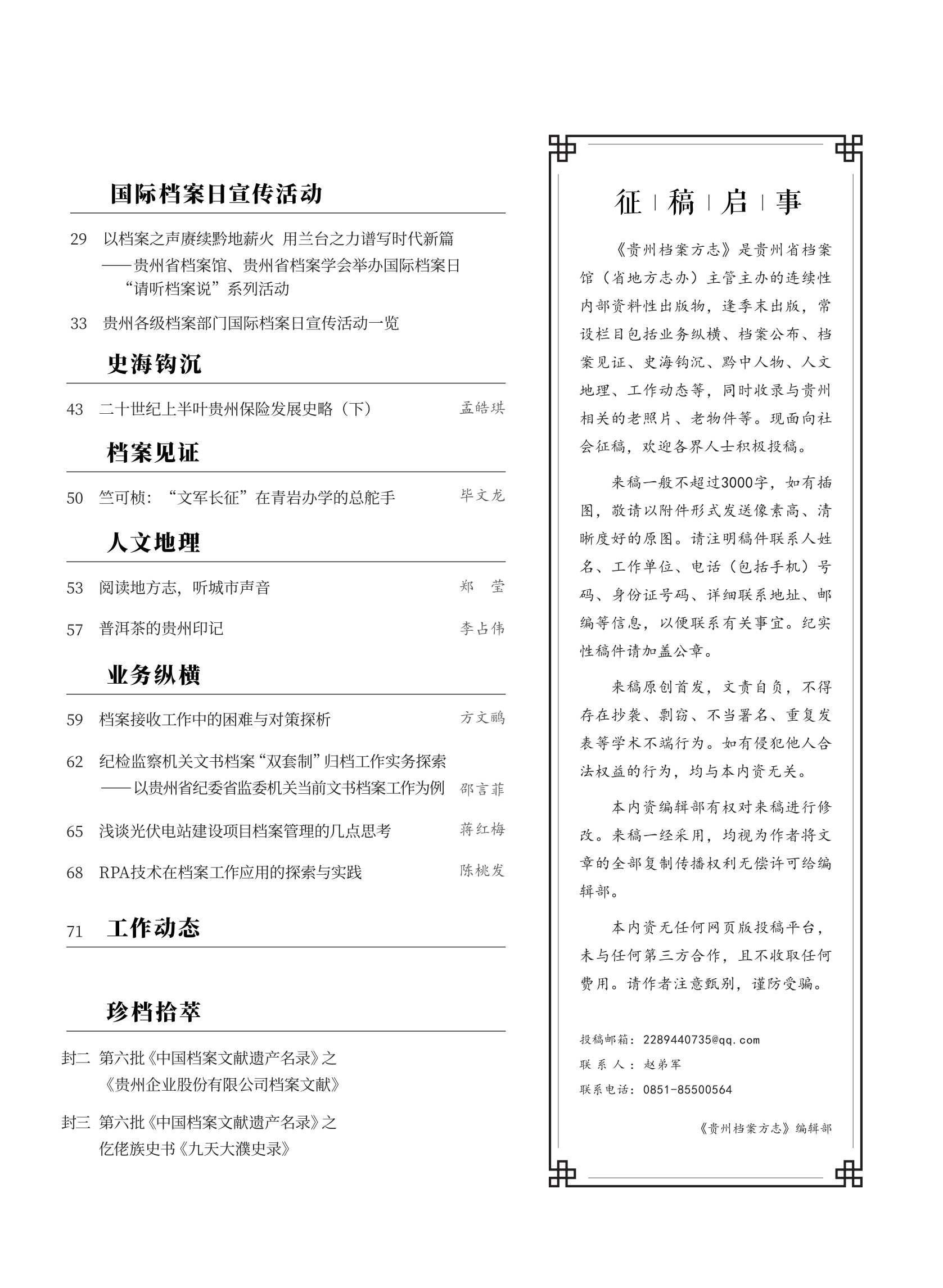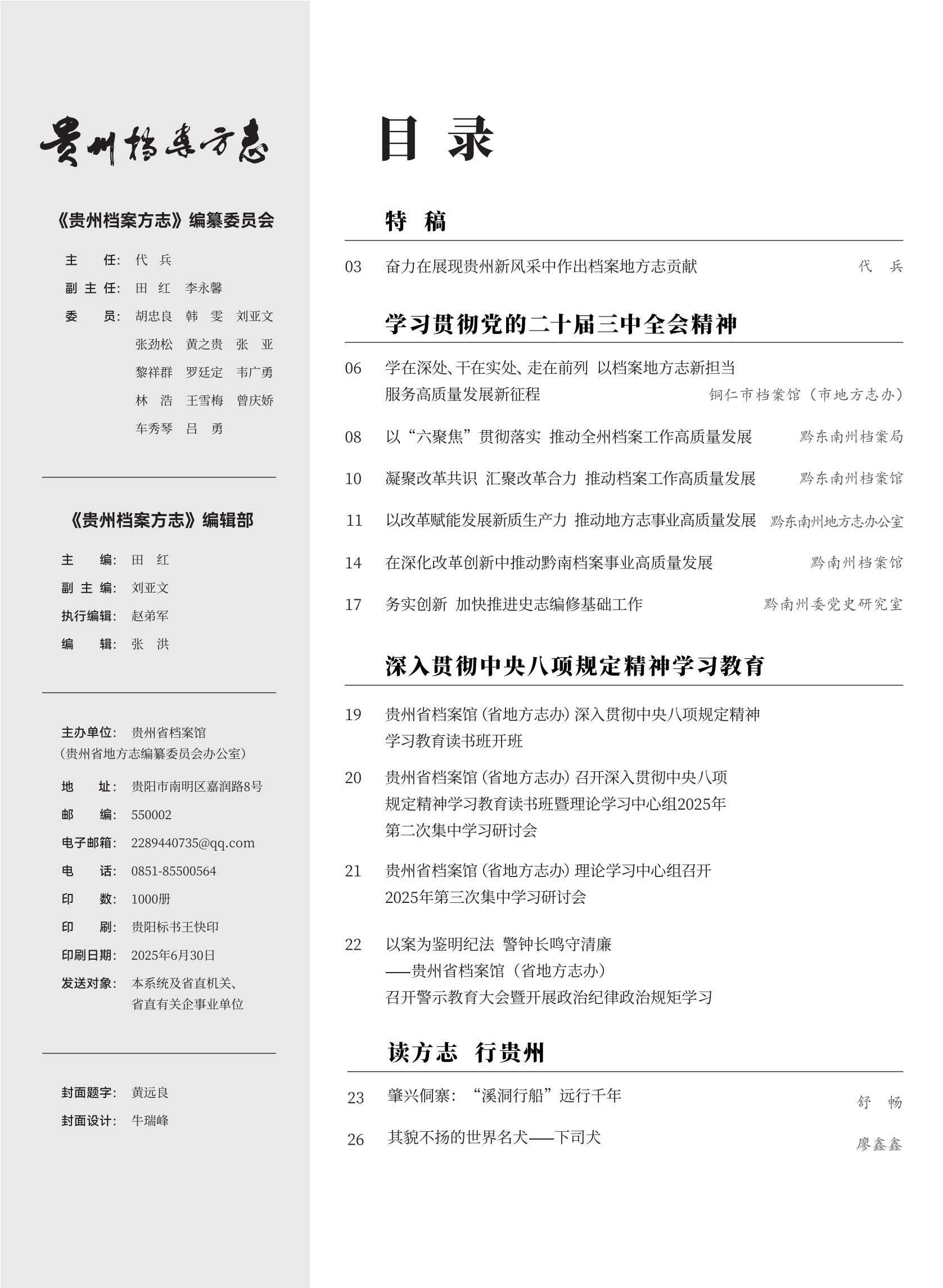 《貴州檔案方志》2025年第2期目錄