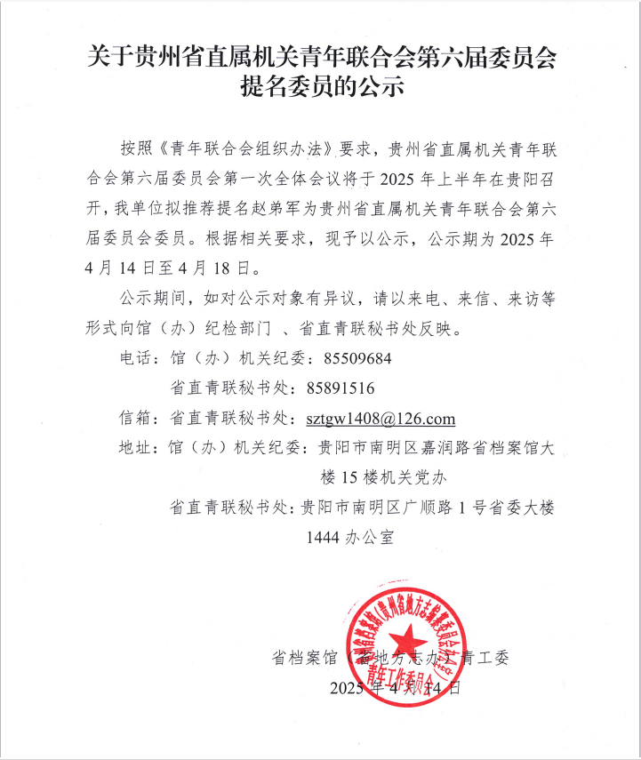 按照《青年聯(lián)合會(huì)組織辦法》要求,貴州省直屬機(jī)關(guān)青年聯(lián)合會(huì)第六屆委員會(huì)第一次全體會(huì)議將于2025年上半年在貴陽(yáng)召開,我單位擬推薦提名趙弟軍為貴州省直屬機(jī)關(guān)青年聯(lián)合會(huì)第六屆委員會(huì)委員。根據(jù)相關(guān)要求,現(xiàn)予以公示,公示期為2025年4月14日至4月18日。