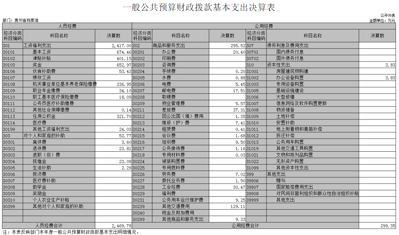貴州省檔案館2019年度一般公共預(yù)算財(cái)政撥款基本支出2,769.13萬元,其中:人員經(jīng)費(fèi)2,469.78萬元,主要包括基本工資、津貼補(bǔ)貼、離退休費(fèi)等;公用經(jīng)費(fèi)299.35萬元,主要包括辦公費(fèi)、水電費(fèi)、差旅費(fèi)等。